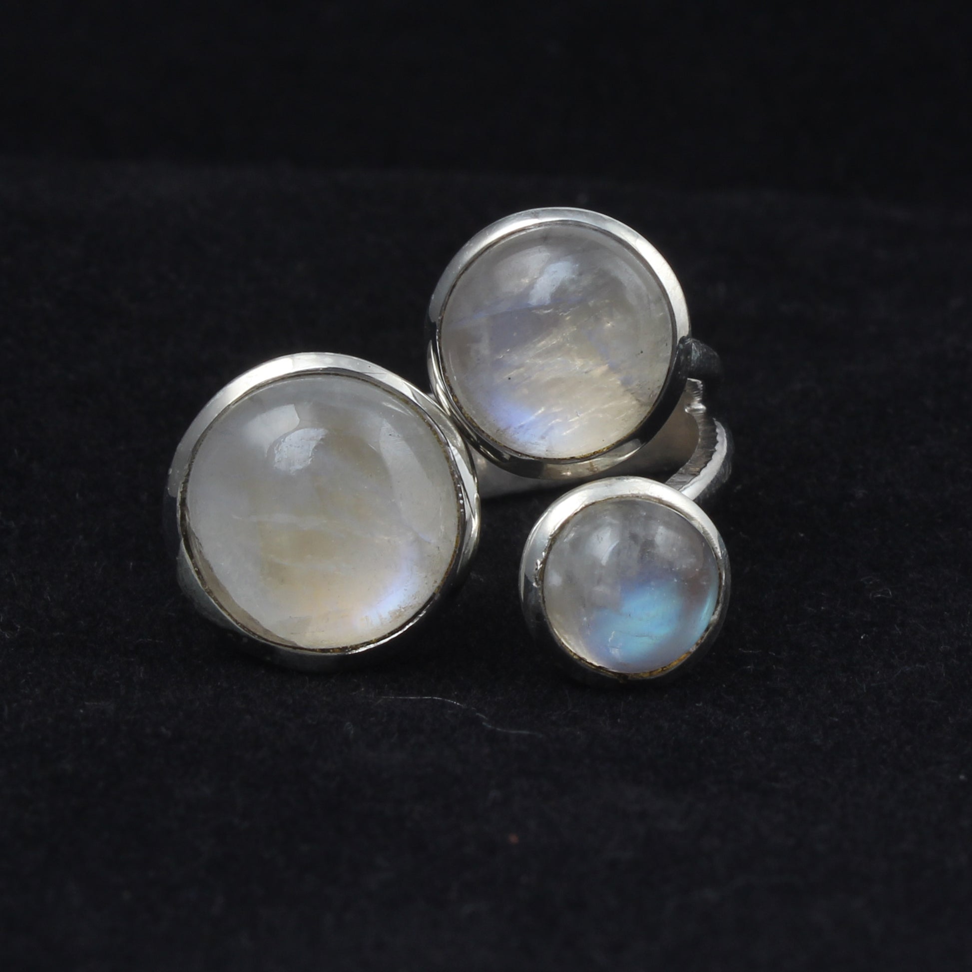 Trio Rainbow Moonstone Ring Handcrafted Adjustable 925 Sterling Silver Natural Round Gemstone Ring