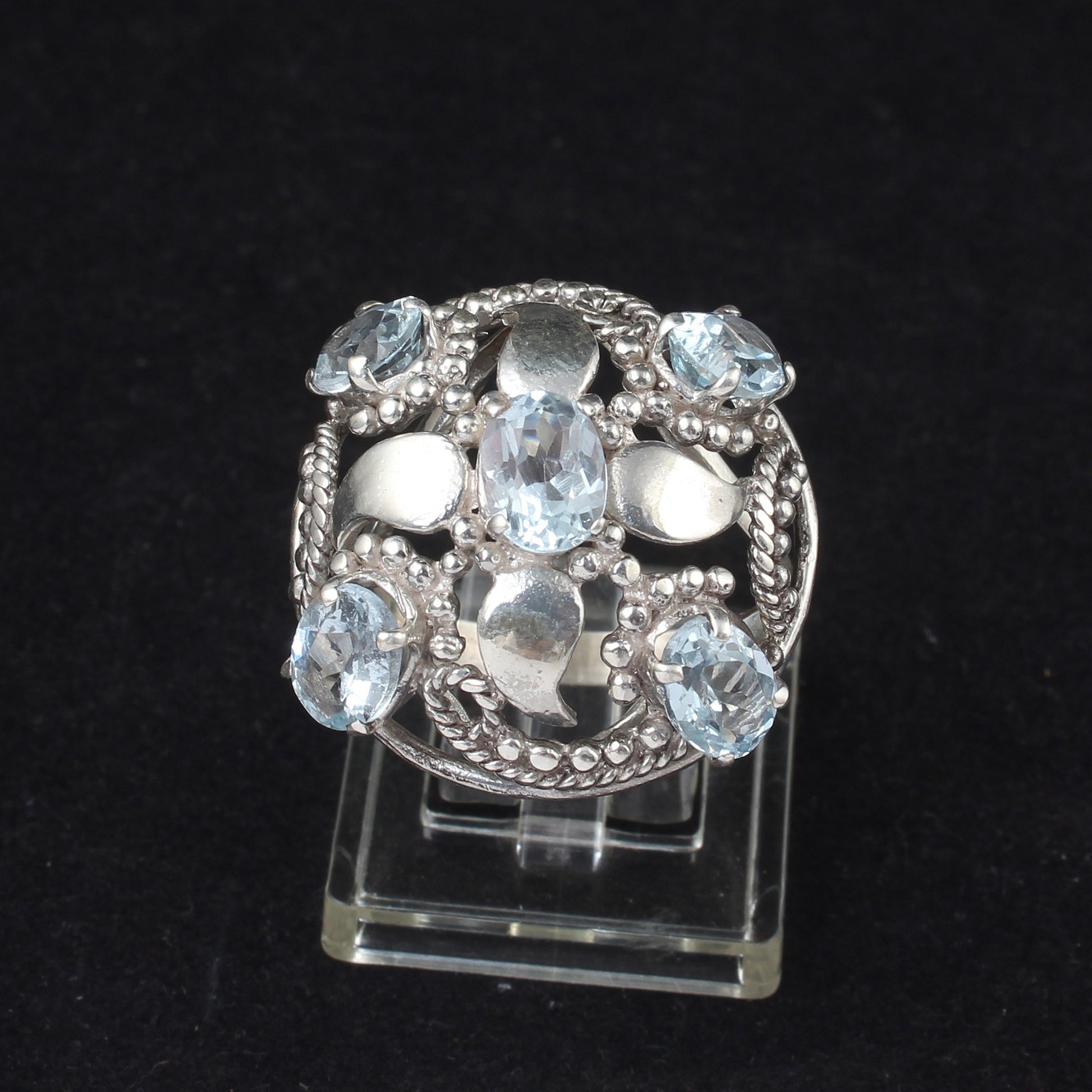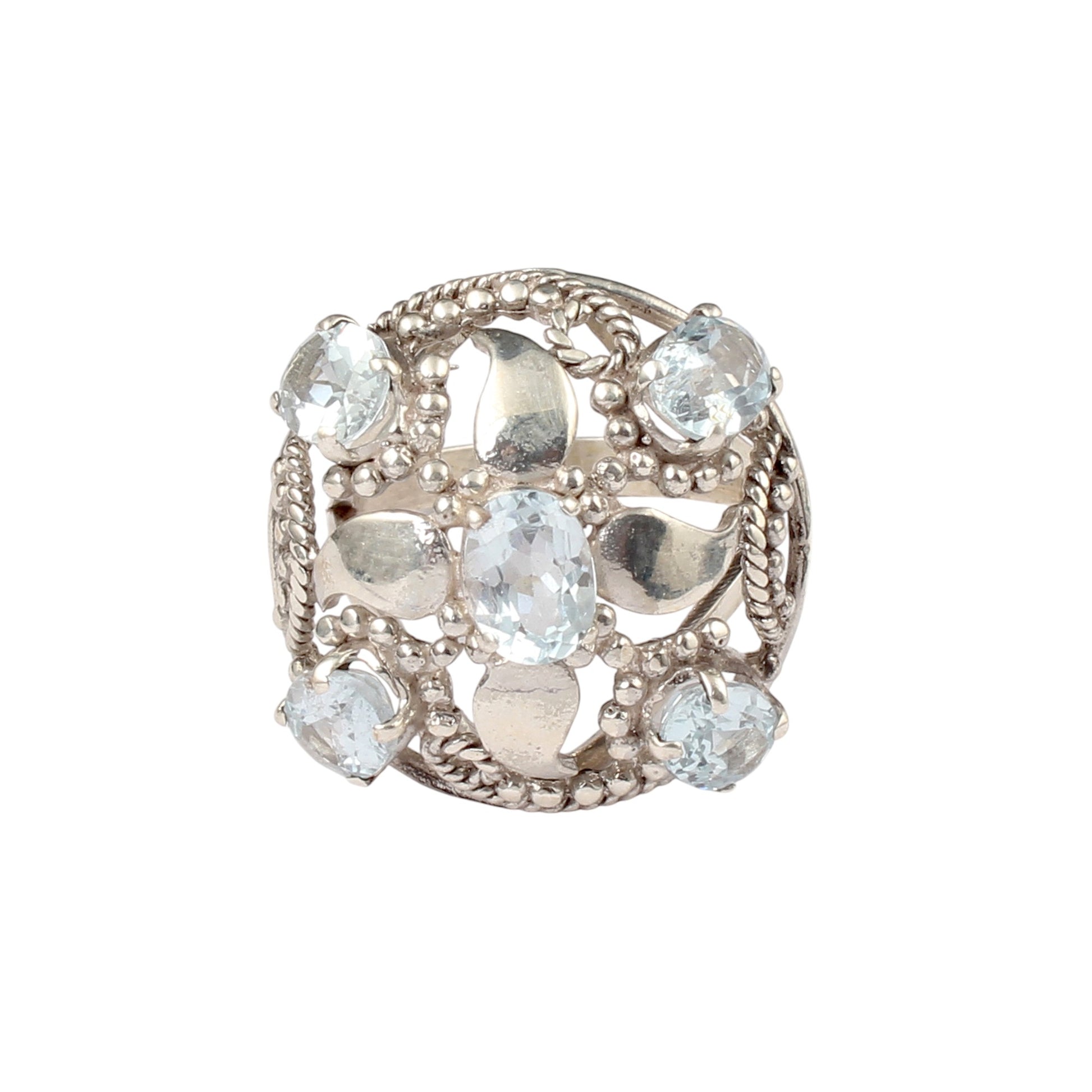Vintage Floral Cluster Silver Ring with Blue Topaz Gemstones Handmade 925 Sterling Silver Jewelry
