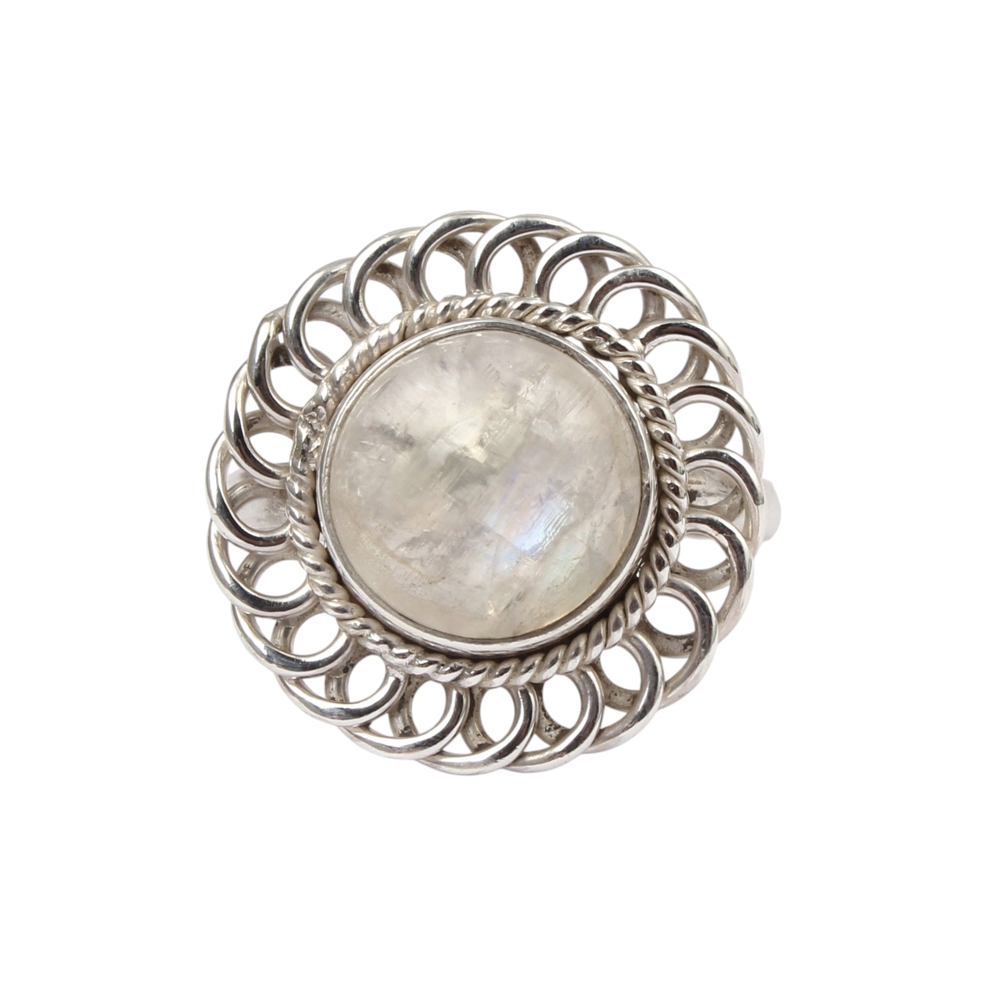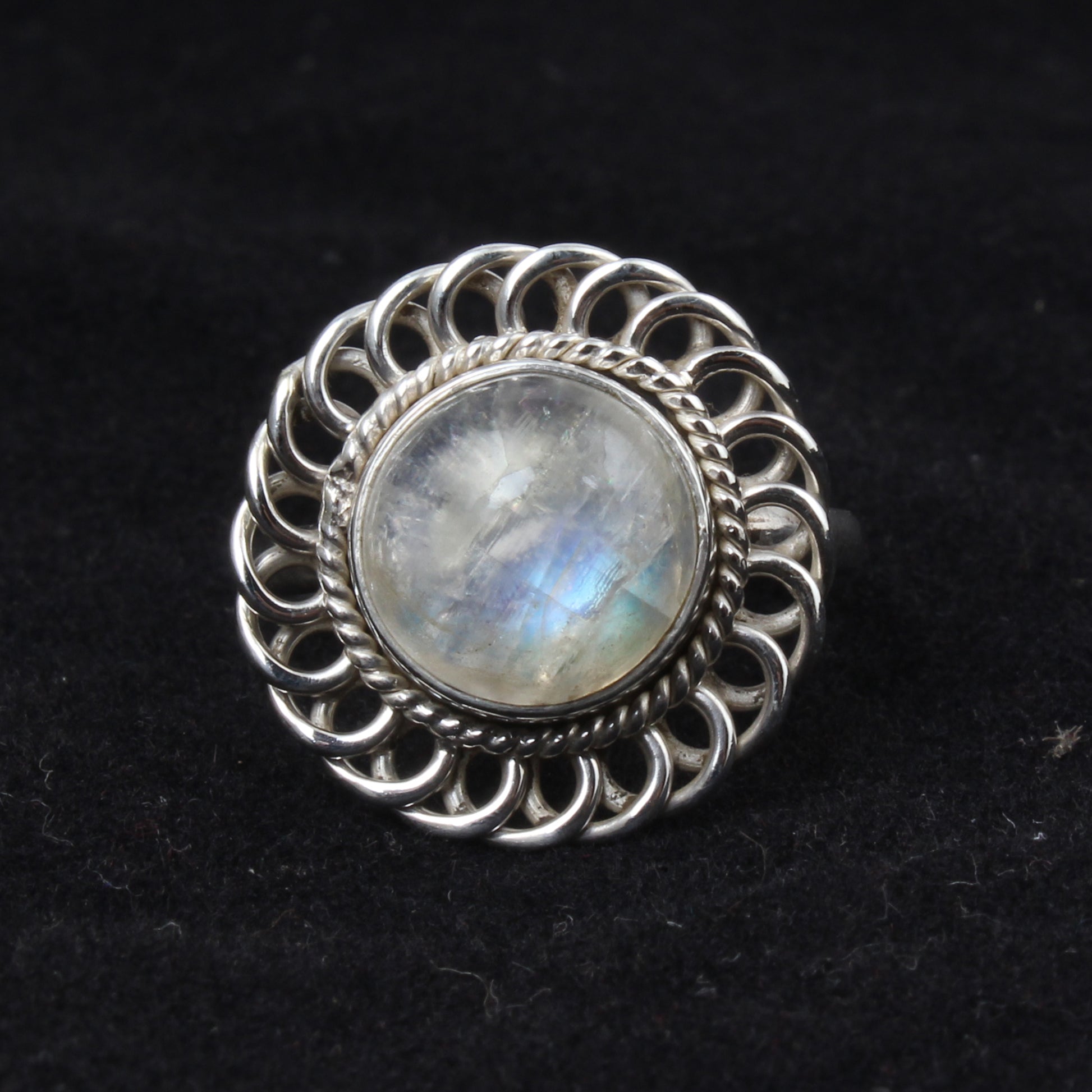 Crafted from 925 sterling silver, this vintage-style cocktail ring features a natural 10mm round rainbow moonstone. Weighing 3.88 grams, it combines expert craftsmanship with timeless elegance, making it a refined statement piece that highlights the stone’s iridescent beauty while ensuring durable wear. Ideal for those who appreciate unique, handcrafted jewelry with a classic touch.
