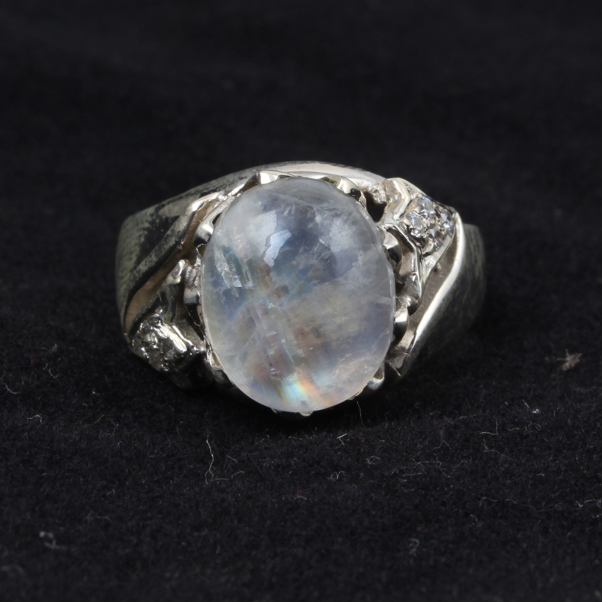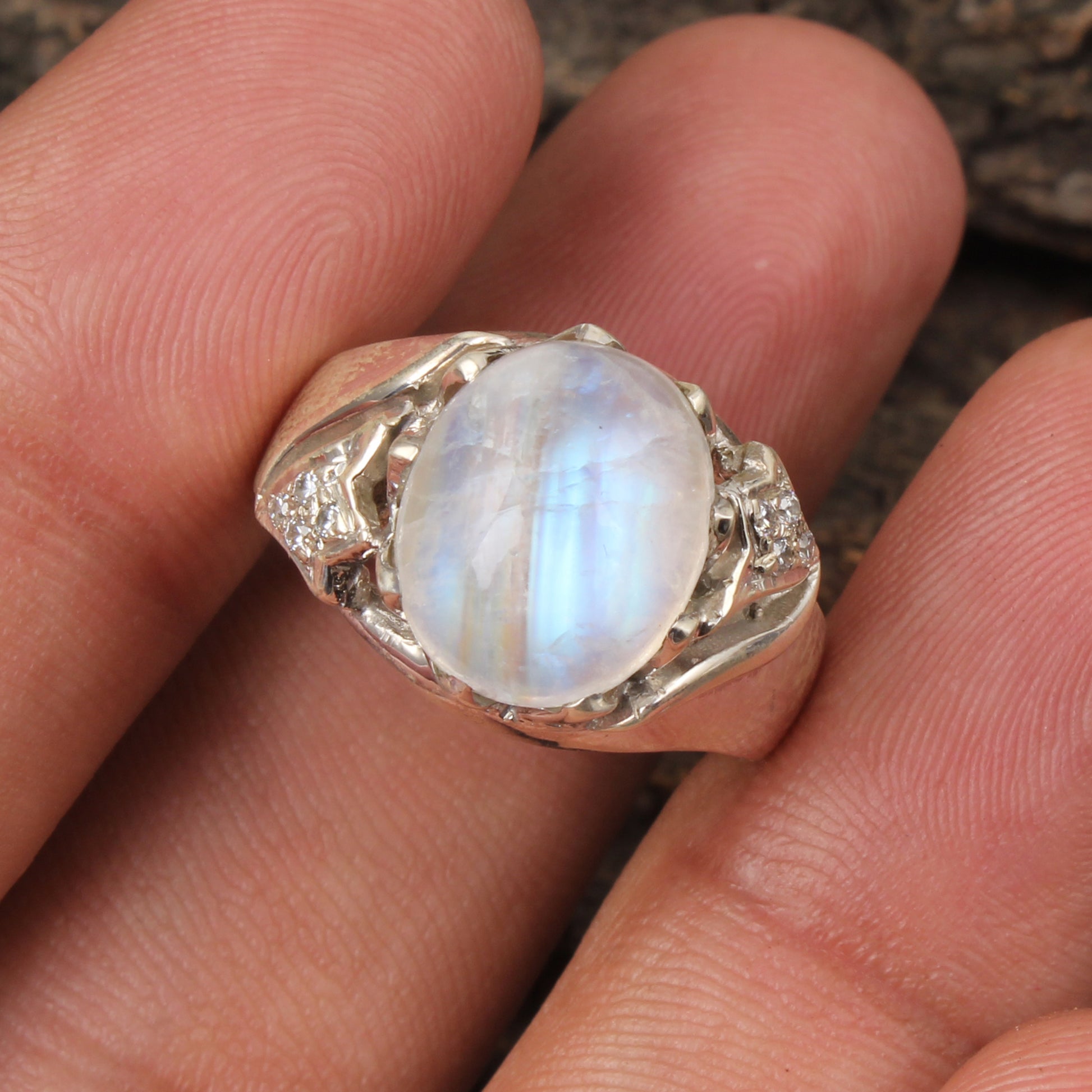 Crafted from 925 sterling silver, this vintage-style ring features a 12x10mm oval rainbow moonstone that displays captivating iridescence. The handmade design is enhanced with sparkling cubic zirconia accents, adding refined elegance and brilliance. Weighing 6.87 grams, this piece combines expert craftsmanship with timeless appeal, ideal for those seeking distinctive and sophisticated jewelry.